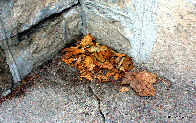 Walking downtown I was struck by the sight of these leaves huddled outside Knox Presbyterian Church. The stonework is quintessentially local to Guelph. This innocuous corner exudes a strong sense of time and place.